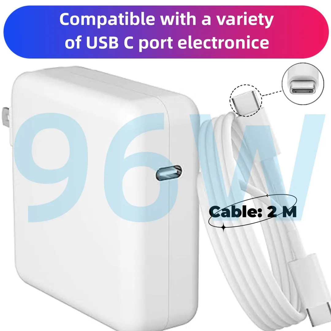 1. 맥북 프로 및 맥북 에어와 완벽 호환: 96W USB C 충전기는 맥북 프로와 맥북 에어 시리즈와 완벽하게 호환됩니다. 강력한 충전능력을 제공하며, 충전 시간을 단축시켜 줍니다. 더 이상 배터리 부족으로 인한 작업 중단 걱정은 없을 것입니다.